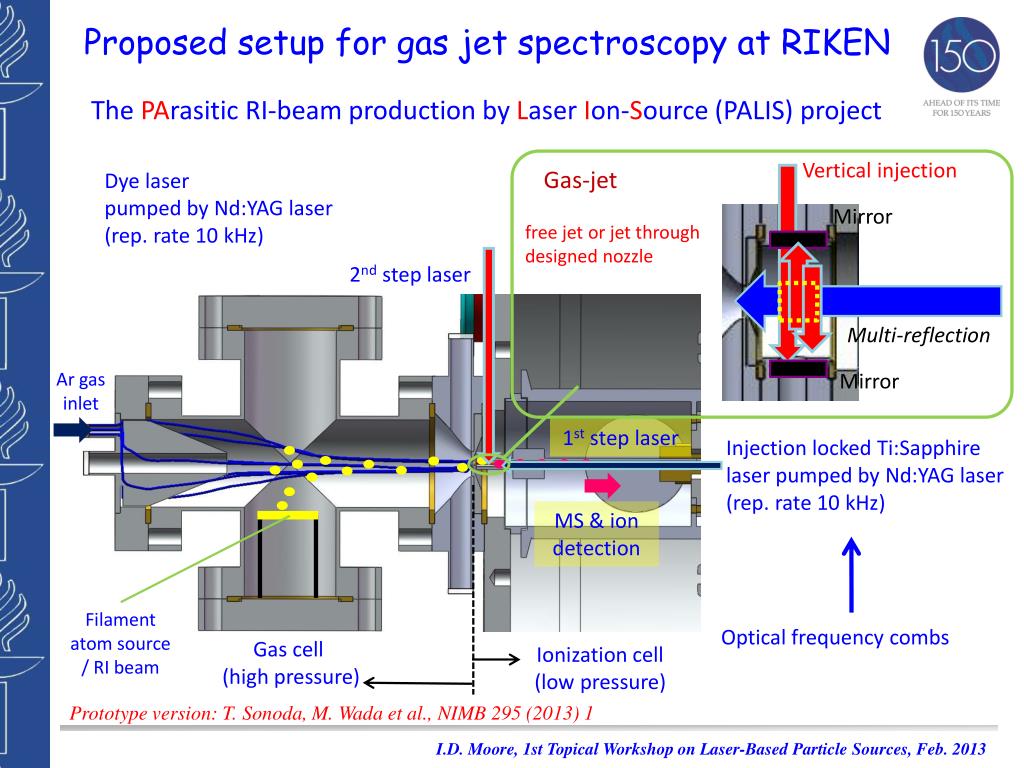 Proposedsetup for gas jet spectroscopy at RIKEN Vertical injection The PArasiticRI-beamproductionbyLaser Ion-Source (PALIS) project Mirror Gas-jet Counter injection Dye laser pumped by Nd:YAG laser (rep. rate 10 kHz) free jet or jet through designed nozzle 2nd step laser Multi-reflection Mirror Ar gas inlet 1st step laser Injection locked Ti:Sapphire laser pumped by Nd:YAG laser (rep. rate 10 kHz) MS & ion detection Filament atom source / RI beam Optical frequency combs Gas cell (high pressure) Ionization cell (low pressure) Prototype version: T. Sonoda, M. Wada et al., NIMB 295 (2013) 1 I.D. Moore, 1st Topical Workshop on Laser-BasedParticleSources, Feb. 2013