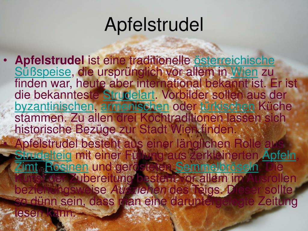 Apfelstrudel • Apfelstrudel ist eine traditionelle österreichischeSüßspeise, die ursprünglich vor allem in Wien zu finden war, heute aber international bekannt ist. Er ist die bekannteste Strudelart. Vorbilder sollen aus der byzantinischen, armenischen oder türkischen Küche stammen. Zu allen drei Kochtraditionen lassen sich historische Bezüge zur Stadt Wien finden. • Apfelstrudel besteht aus einer länglichen Rolle aus Strudelteig mit einer Füllung aus zerkleinerten Äpfeln, Zimt, Rosinen und gerösteten Semmelbröseln. Die Kunst der Zubereitung besteht vor allem im Ausrollen beziehungsweise Ausziehen des Teigs. Dieser sollte so dünn sein, dass man eine daruntergelegte Zeitung lesen kann.