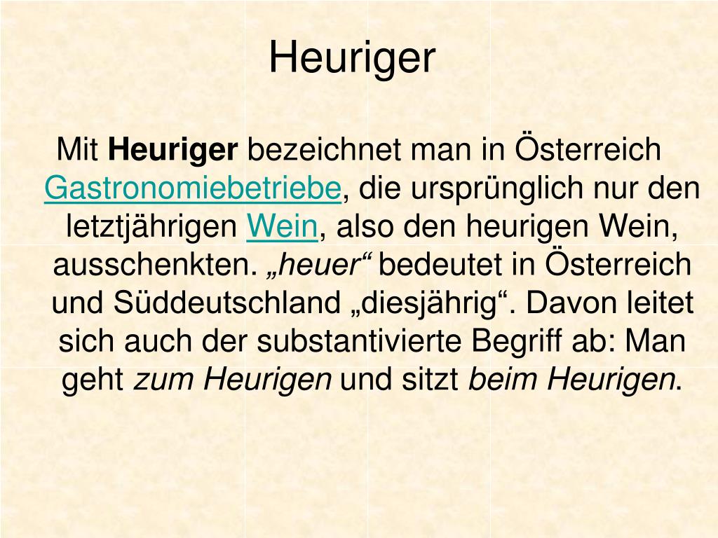 Heuriger Mit Heuriger bezeichnet man in Österreich Gastronomiebetriebe, die ursprünglich nur den letztjährigen Wein, also den heurigen Wein, ausschenkten. „heuer“ bedeutet in Österreich und Süddeutschland „diesjährig“. Davon leitet sich auch der substantivierte Begriff ab: Man geht zum Heurigen und sitzt beim Heurigen.