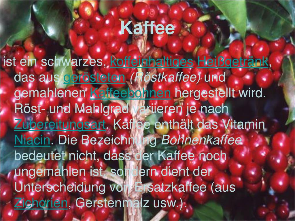 Kaffee ist ein schwarzes, koffeinhaltigesHeißgetränk, das aus gerösteten(Röstkaffee) und gemahlenen Kaffeebohnen hergestellt wird. Röst- und Mahlgrad variieren je nach Zubereitungsart. Kaffee enthält das Vitamin Niacin. Die Bezeichnung Bohnenkaffee bedeutet nicht, dass der Kaffee noch ungemahlen ist, sondern dient der Unterscheidung von Ersatzkaffee (aus Zichorien, Gerstenmalz usw.).