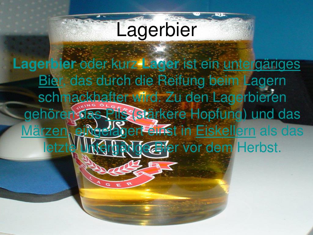 Lagerbier Lagerbier oder kurz Lager ist ein untergärigesBier, das durch die Reifung beim Lagern schmackhafter wird. Zu den Lagerbieren gehören das Pils (stärkere Hopfung) und das Märzen, eingelagert einst in Eiskellern als das letzte untergärige Bier vor dem Herbst.
