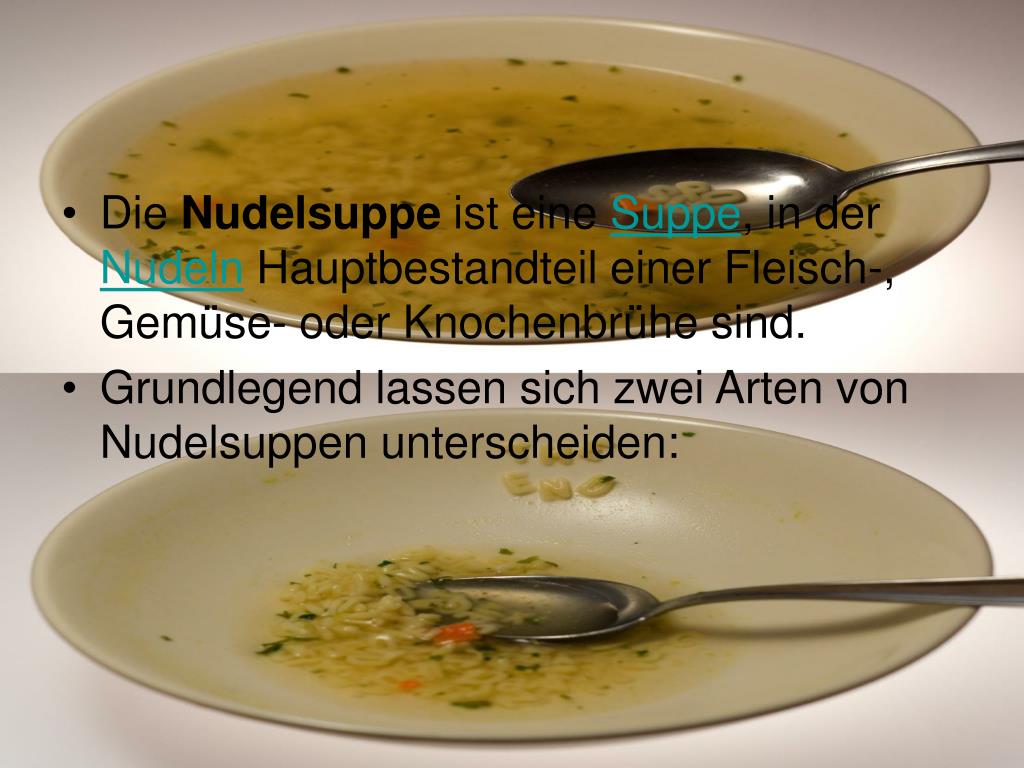 Die Nudelsuppe ist eine Suppe, in der Nudeln Hauptbestandteil einer Fleisch-, Gemüse- oder Knochenbrühe sind. • Grundlegend lassen sich zwei Arten von Nudelsuppen unterscheiden: