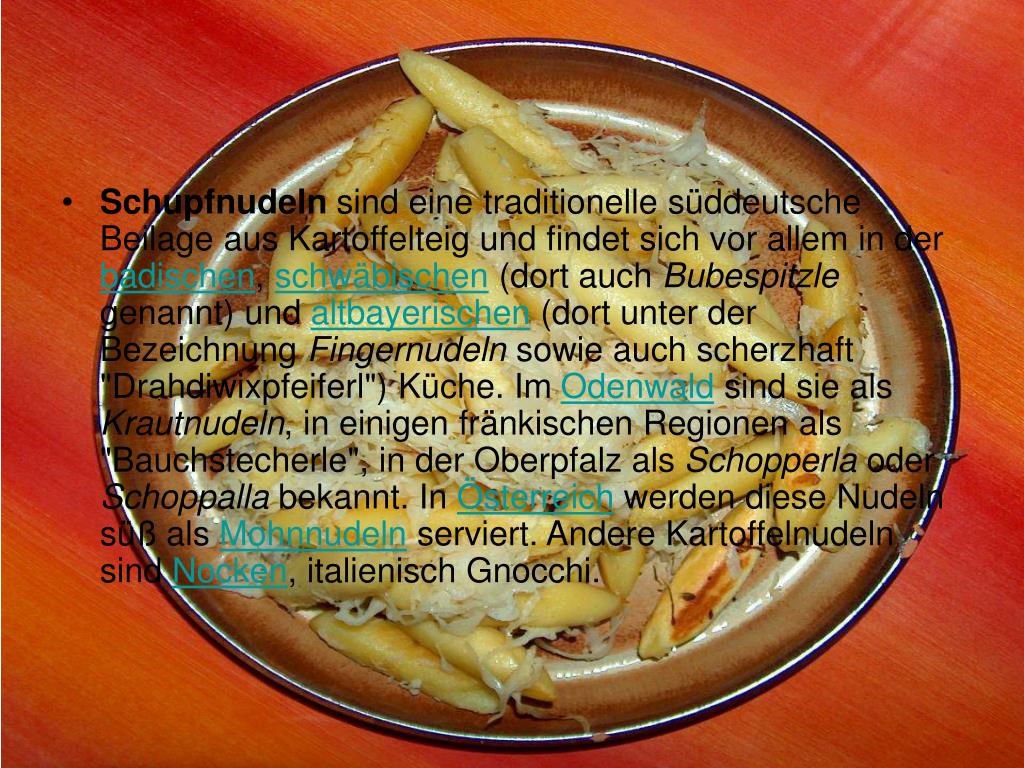 Schupfnudeln sind eine traditionelle süddeutsche Beilage aus Kartoffelteig und findet sich vor allem in der badischen, schwäbischen (dort auch Bubespitzle genannt) und altbayerischen (dort unter der Bezeichnung Fingernudeln sowie auch scherzhaft "Drahdiwixpfeiferl") Küche. Im Odenwald sind sie als Krautnudeln, in einigen fränkischen Regionen als "Bauchstecherle", in der Oberpfalz als Schopperla oder Schoppalla bekannt. In Österreich werden diese Nudeln süß als Mohnnudeln serviert. Andere Kartoffelnudeln sind Nocken, italienisch Gnocchi.