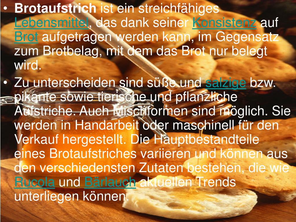 Brotaufstrich ist ein streichfähiges Lebensmittel, das dank seiner Konsistenz auf Brot aufgetragen werden kann, im Gegensatz zum Brotbelag, mit dem das Brot nur belegt wird. • Zu unterscheiden sind süße und salzige bzw. pikante sowie tierische und pflanzliche Aufstriche. Auch Mischformen sind möglich. Sie werden in Handarbeit oder maschinell für den Verkauf hergestellt. Die Hauptbestandteile eines Brotaufstriches variieren und können aus den verschiedensten Zutaten bestehen, die wie Rucola und Bärlauch aktuellen Trends unterliegen können.