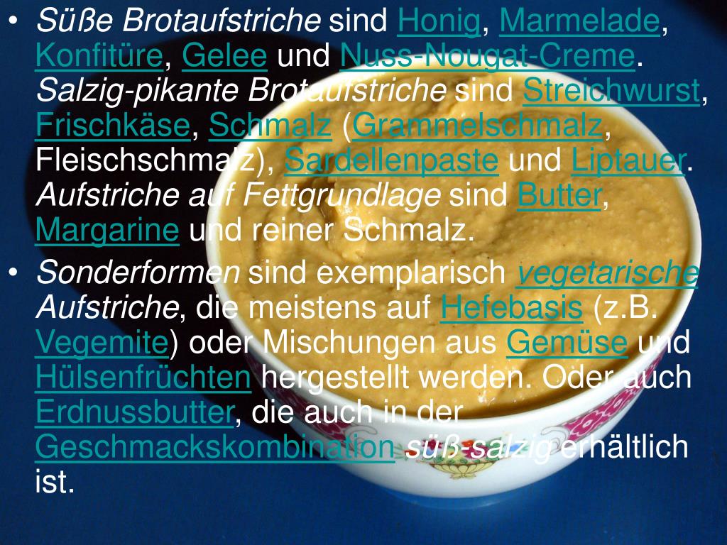 Süße Brotaufstriche sind Honig, Marmelade, Konfitüre, Gelee und Nuss-Nougat-Creme. Salzig-pikante Brotaufstriche sind Streichwurst, Frischkäse, Schmalz (Grammelschmalz, Fleischschmalz), Sardellenpaste und Liptauer. Aufstriche auf Fettgrundlage sind Butter, Margarine und reiner Schmalz. • Sonderformen sind exemplarisch vegetarische Aufstriche, die meistens auf Hefebasis (z.B. Vegemite) oder Mischungen aus Gemüse und Hülsenfrüchten hergestellt werden. Oder auch Erdnussbutter, die auch in der Geschmackskombinationsüß-salzig erhältlich ist.