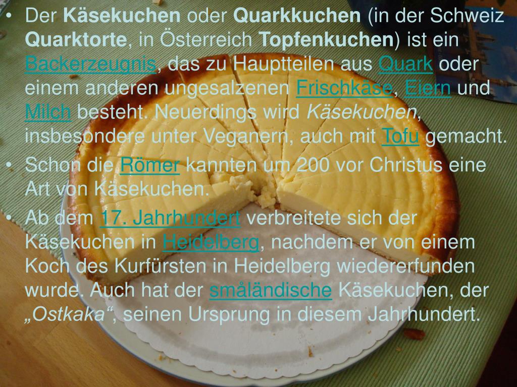 Der Käsekuchen oder Quarkkuchen (in der Schweiz Quarktorte, in Österreich Topfenkuchen) ist ein Backerzeugnis, das zu Hauptteilen aus Quark oder einem anderen ungesalzenen Frischkäse, Eiern und Milch besteht. Neuerdings wird Käsekuchen, insbesondere unter Veganern, auch mit Tofu gemacht. • Schon die Römer kannten um 200 vor Christus eine Art von Käsekuchen. • Ab dem 17. Jahrhundert verbreitete sich der Käsekuchen in Heidelberg, nachdem er von einem Koch des Kurfürsten in Heidelberg wiedererfunden wurde. Auch hat der småländische Käsekuchen, der „Ostkaka“, seinen Ursprung in diesem Jahrhundert.