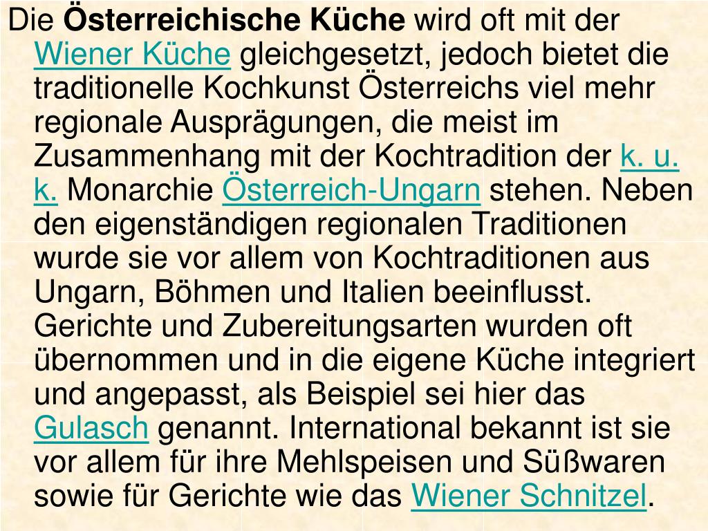 Die Österreichische Küche wird oft mit der Wiener Küche gleichgesetzt, jedoch bietet die traditionelle Kochkunst Österreichs viel mehr regionale Ausprägungen, die meist im Zusammenhang mit der Kochtradition der k. u. k. Monarchie Österreich-Ungarn stehen. Neben den eigenständigen regionalen Traditionen wurde sie vor allem von Kochtraditionen aus Ungarn, Böhmen und Italien beeinflusst. Gerichte und Zubereitungsarten wurden oft übernommen und in die eigene Küche integriert und angepasst, als Beispiel sei hier das Gulasch genannt. International bekannt ist sie vor allem für ihre Mehlspeisen und Süßwaren sowie für Gerichte wie das Wiener Schnitzel.
