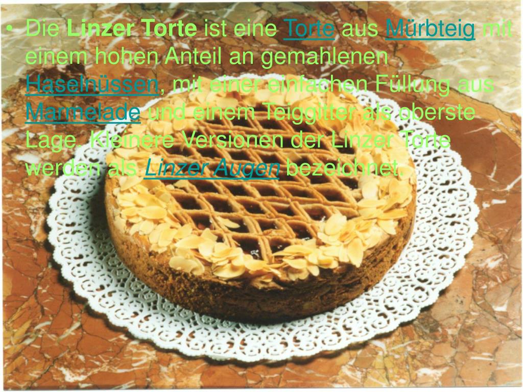 Die Linzer Torte ist eine Torte aus Mürbteig mit einem hohen Anteil an gemahlenen Haselnüssen, mit einer einfachen Füllung aus Marmelade und einem Teiggitter als oberste Lage. Kleinere Versionen der Linzer Torte werden als Linzer Augen bezeichnet.