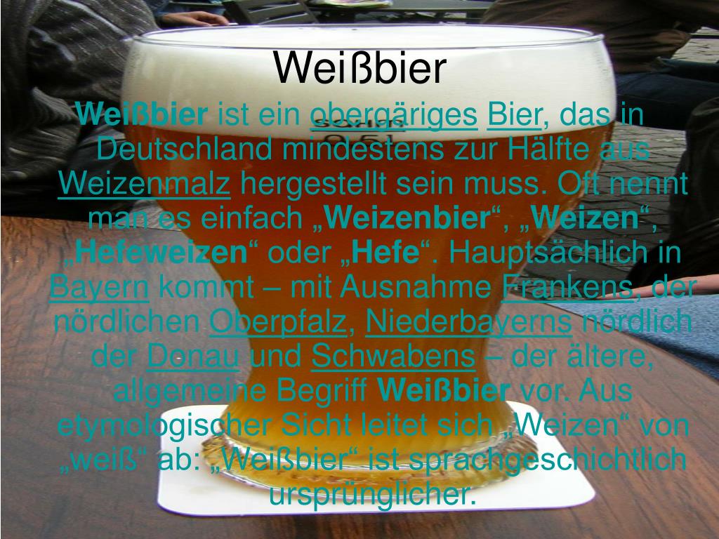 Weißbier Weißbier ist ein obergärigesBier, das in Deutschland mindestens zur Hälfte aus Weizenmalz hergestellt sein muss. Oft nennt man es einfach „Weizenbier“, „Weizen“, „Hefeweizen“ oder „Hefe“. Hauptsächlich in Bayern kommt – mit Ausnahme Frankens, der nördlichen Oberpfalz, Niederbayerns nördlich der Donau und Schwabens – der ältere, allgemeine Begriff Weißbier vor. Aus etymologischer Sicht leitet sich „Weizen“ von „weiß“ ab: „Weißbier“ ist sprachgeschichtlich ursprünglicher.