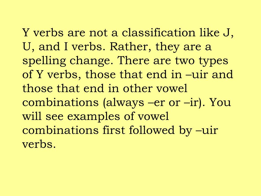 Y verbs are not a classification like J, U, and I verbs. Rather, they are a spelling change. There are two types of Y verbs, those that end in –uir and those that end in other vowel combinations (always –er or –ir). You will see examples of vowel combinations first followed by –uir verbs.