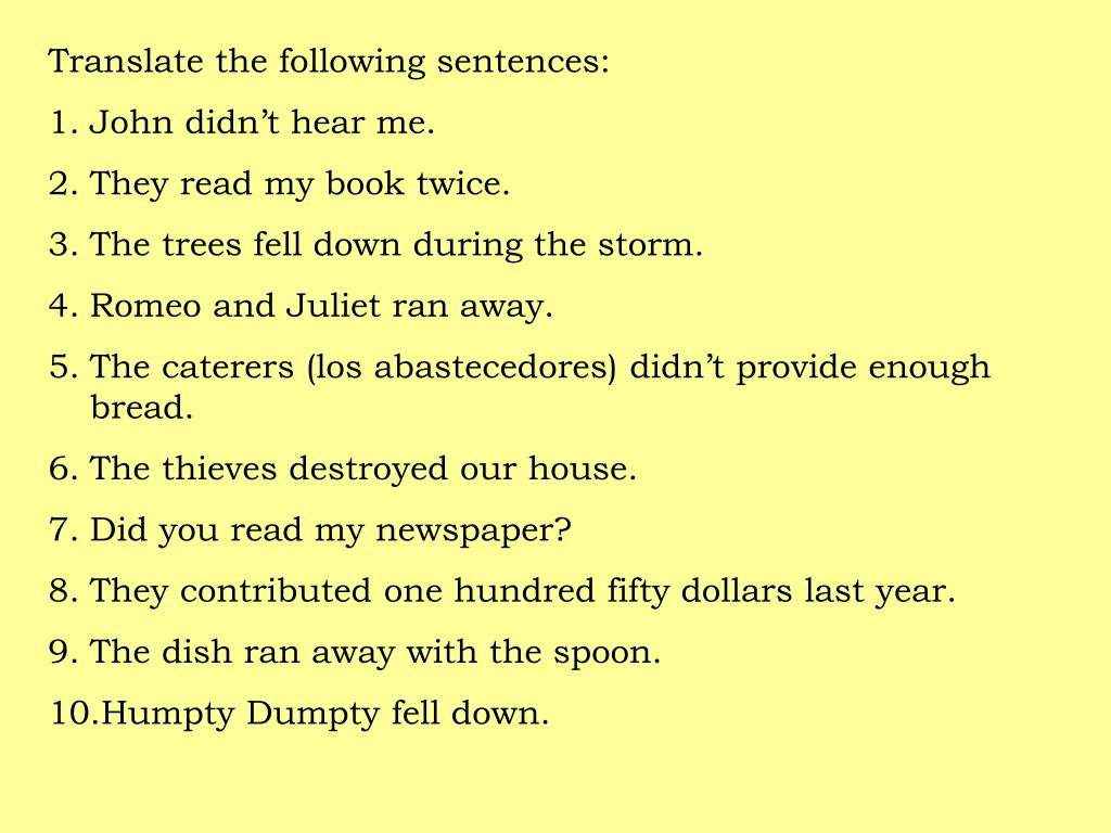 Translate the following sentences: • John didn’t hear me. • They read my book twice. • The trees fell down during the storm. • Romeo and Juliet ran away. • The caterers (los abastecedores) didn’t provide enough bread. • The thieves destroyed our house. • Did you read my newspaper? • They contributed one hundred fifty dollars last year. • The dish ran away with the spoon. • Humpty Dumpty fell down.