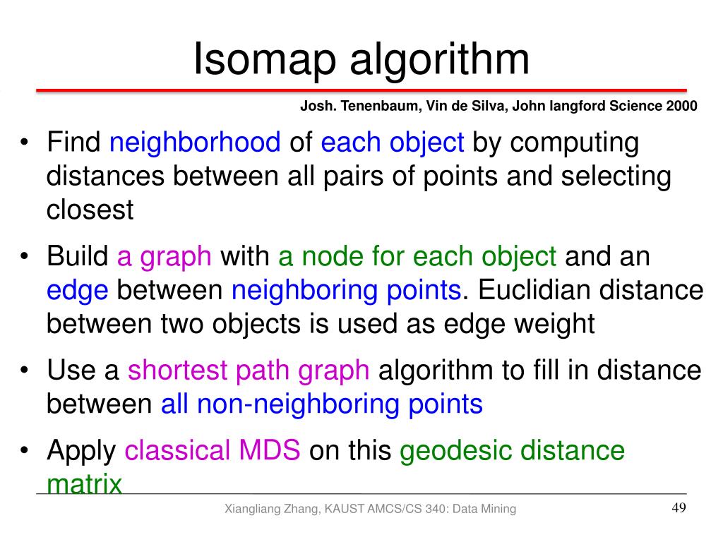 Find neighborhood of each object by computing distances between all pairs of points and selecting closest Build a graph with a node for each object and an edge between neighboring points. Euclidian distance between two objects is used as edge weight Use a shortest path graph algorithm to fill in distance between all non-neighboring points Apply classical MDS on this geodesic distance matrix Isomap algorithm Josh. Tenenbaum, Vin de Silva, John langford Science 2000 49 Xiangliang Zhang, KAUST AMCS/CS 340: Data Mining
