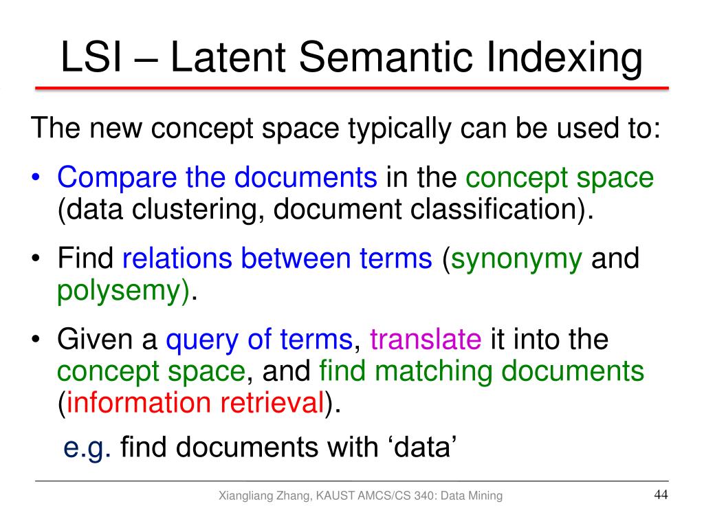 The new concept space typically can be used to: Compare the documents in the concept space (data clustering, document classification). Find relations between terms (synonymy and polysemy). Given a query of terms, translate it into the concept space, and find matching documents (information retrieval). e.g. find documents with ‘data’ LSI – Latent Semantic Indexing 44 Xiangliang Zhang, KAUST AMCS/CS 340: Data Mining