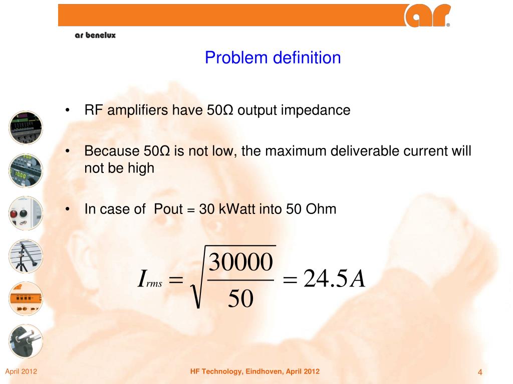 Problem definition • RF amplifiers have 50Ω output impedance • Because 50Ω is not low, the maximum deliverable current will not be high • In case of Pout = 30 kWatt into 50 Ohm HF Technology, Eindhoven, April 2012