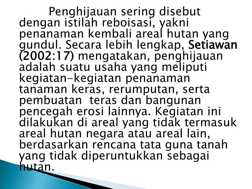 Penghijauanseringdisebutdenganistilahreboisasi, yaknipenanamankembali areal hutan yang gundul. Secaralebihlengkap, Setiawan (2002:17)mengatakan, penghijauanadalahsuatuusaha yang meliputikegiatan-kegiatanpenanamantanamankeras, rerumputan, sertapembuatanterasdanbangunanpencegaherosilainnya. Kegiataninidilakukandi areal yang tidaktermasuk areal hutannegaraatau areal lain, berdasarkanrencanatatagunatanah yang tidakdiperuntukkansebagaihutan.