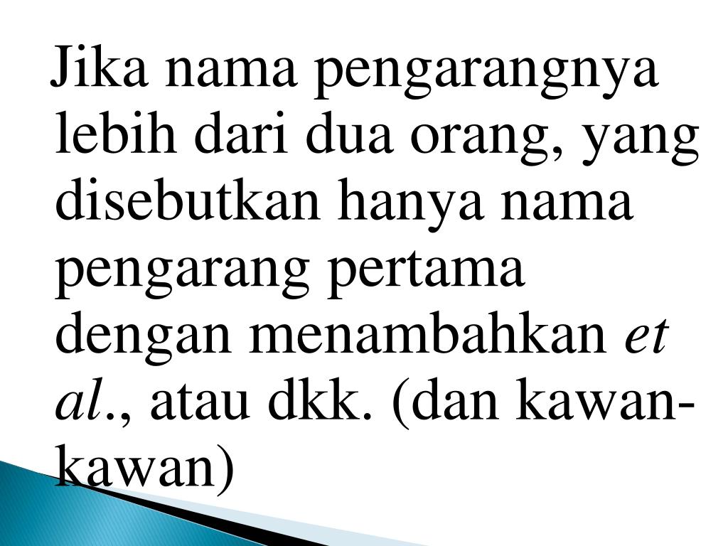 4.Jika buku, majalah, atausurat kabarditulisolehdua tau tiga orang, namapengarang dicantumkansemua. 5.Pengarang yang lebihdaritiga orang, ditulishanyanama pengarangpertama, laludi belakangnyaditulis et al., atau dkk.