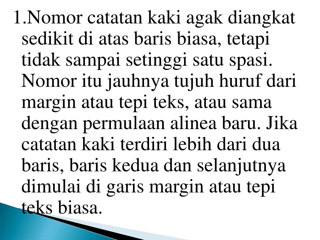 1.Nomor catatan kaki agakdiangkatsedikitdiatasbarisbiasa, tetapitidaksampaisetinggisatuspasi. Nomoritujauhnyatujuhhurufdari margin atautepiteks, atausamadenganpermulaanalineabaru. Jikacatatan kaki terdirilebihdariduabaris, bariskeduadanselanjutnyadimulaidigaris margin atautepiteksbiasa.