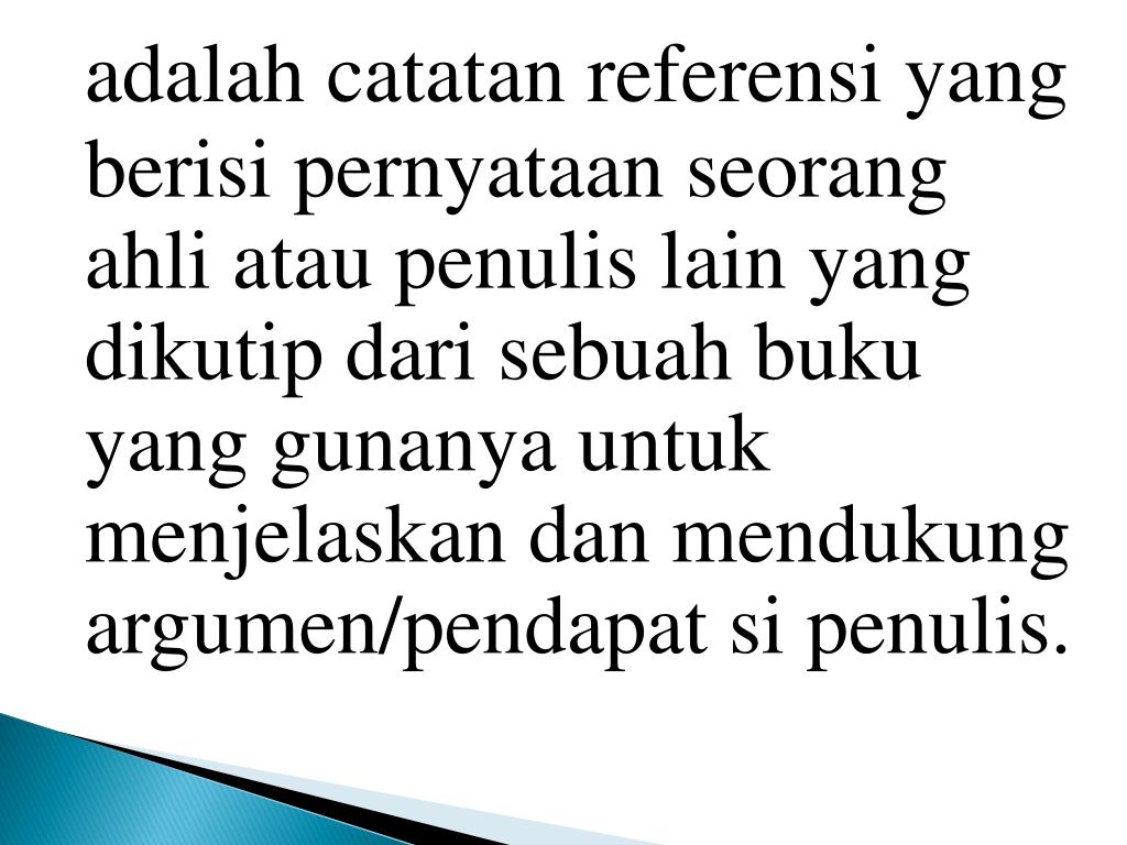 adalahcatatanreferensi yang berisipernyataanseorangahliataupenulis lain yang dikutipdarisebuahbuku yang gunanyauntukmenjelaskandanmendukungargumen/pendapatsipenulis.