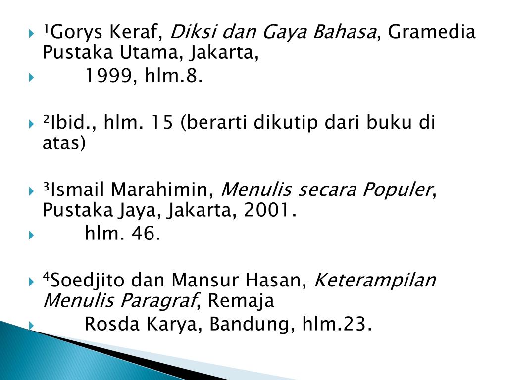 ¹Gorys Keraf, Diksidan Gaya Bahasa, GramediaPustakaUtama, Jakarta, • 1999, hlm.8. • ²Ibid., hlm. 15 (berartidikutipdaribukudiatas) • ³Ismail Marahimin, MenulissecaraPopuler, Pustaka Jaya, Jakarta, 2001. • hlm. 46. • 4Soedjito dan Mansur Hasan, KeterampilanMenulisParagraf, Remaja • RosdaKarya, Bandung, hlm.23.
