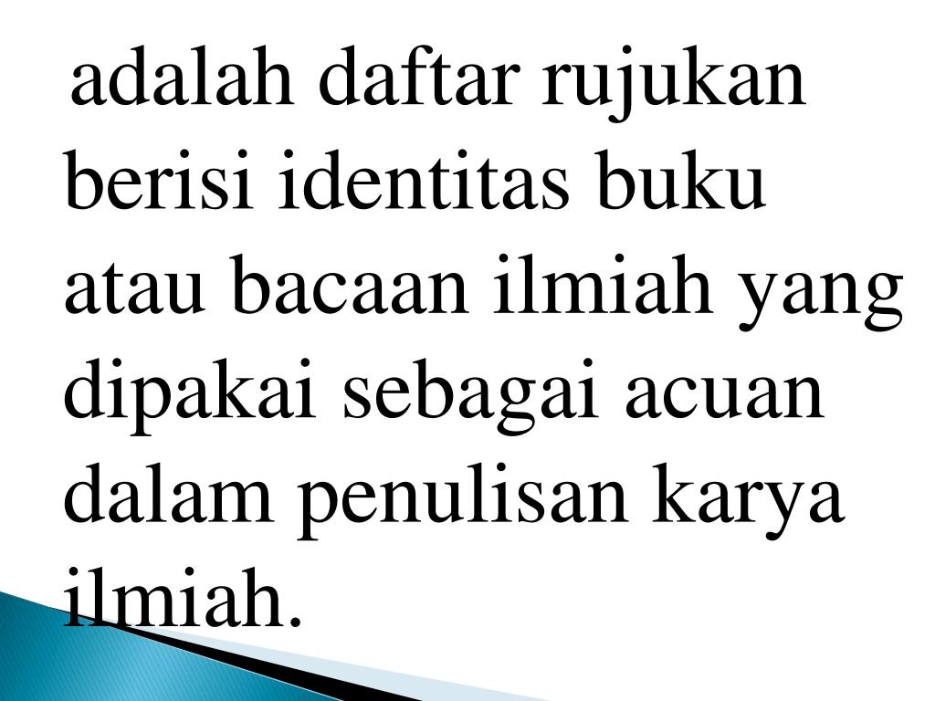 adalahdaftarrujukanberisiidentitasbukuataubacaanilmiah yang dipakaisebagaiacuandalampenulisankaryailmiah.