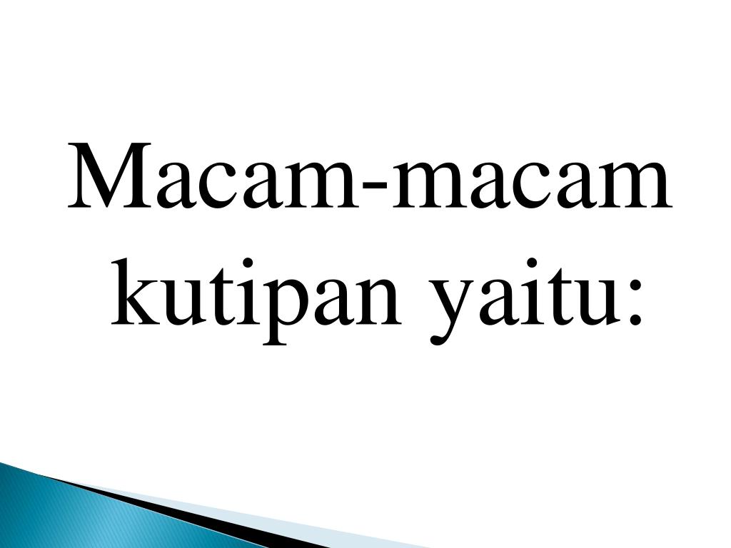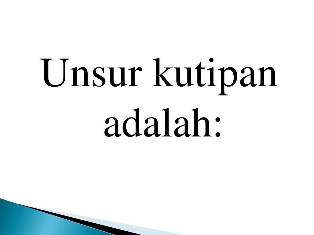 KUTIPAN, CATATAN KAKI DAN DAFTAR PUSTAKA. KUTIPAN. adalah catatan referensi yang berisi pernyataan seorang ahli atau penulis lain yang dikutip dari sebuah buku yang gunanya untuk menjelaskan dan mendukung argumen / pendapat si penulis . Unsur kutipan adalah :.