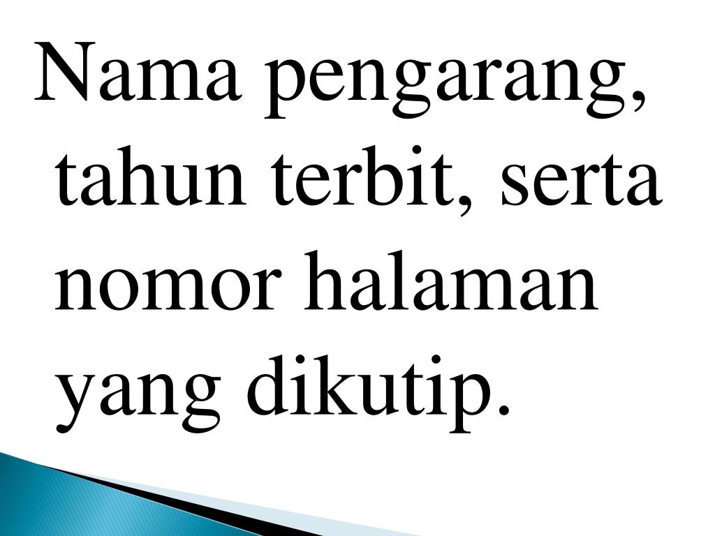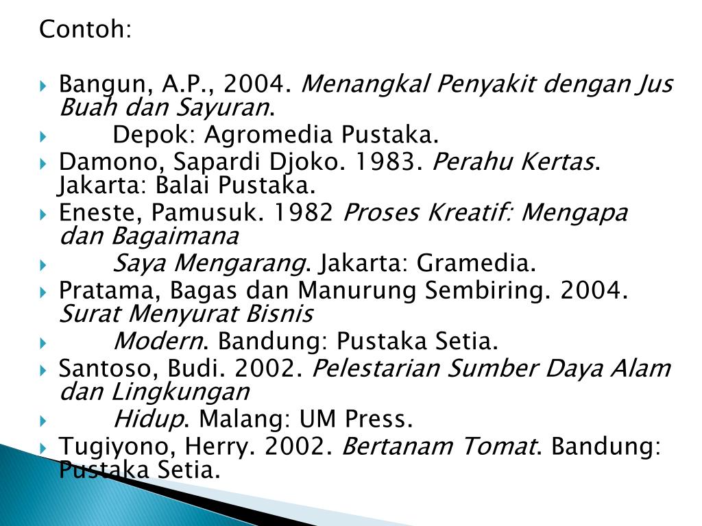 Contoh: • Bangun, A.P., 2004. MenangkalPenyakitdengan Jus BuahdanSayuran. • Depok: AgromediaPustaka. • Damono, SapardiDjoko. 1983. PerahuKertas. Jakarta: BalaiPustaka. • Eneste, Pamusuk. 1982 ProsesKreatif: MengapadanBagaimana • SayaMengarang. Jakarta: Gramedia. • Pratama, BagasdanManurungSembiring. 2004. SuratMenyuratBisnis • Modern. Bandung: PustakaSetia. • Santoso, Budi. 2002. PelestarianSumberDayaAlamdanLingkungan • Hidup. Malang: UM Press. • Tugiyono, Herry. 2002. BertanamTomat. Bandung: PustakaSetia.