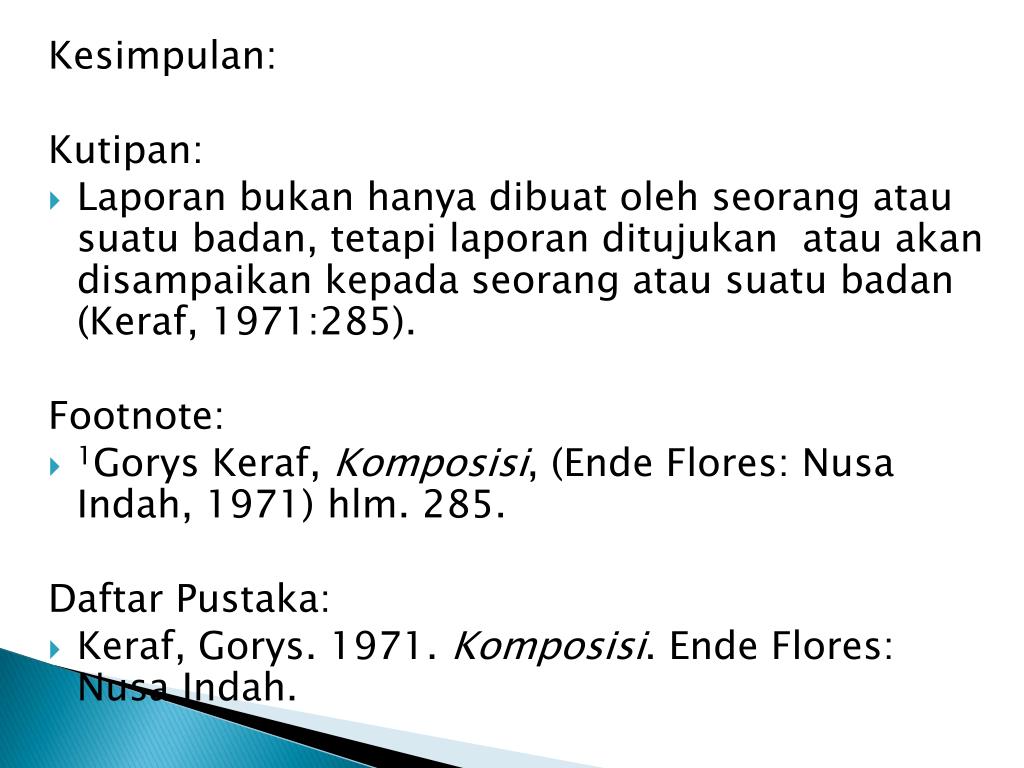 Kesimpulan: Kutipan: • Laporanbukanhanyadibuatolehseorangatausuatubadan, tetapilaporanditujukanatauakandisampaikankepadaseorangatausuatubadan (Keraf, 1971:285). Footnote: • 1Gorys Keraf, Komposisi, (Ende Flores: Nusa Indah, 1971) hlm. 285. DaftarPustaka: • Keraf, Gorys. 1971. Komposisi. Ende Flores: Nusa Indah.