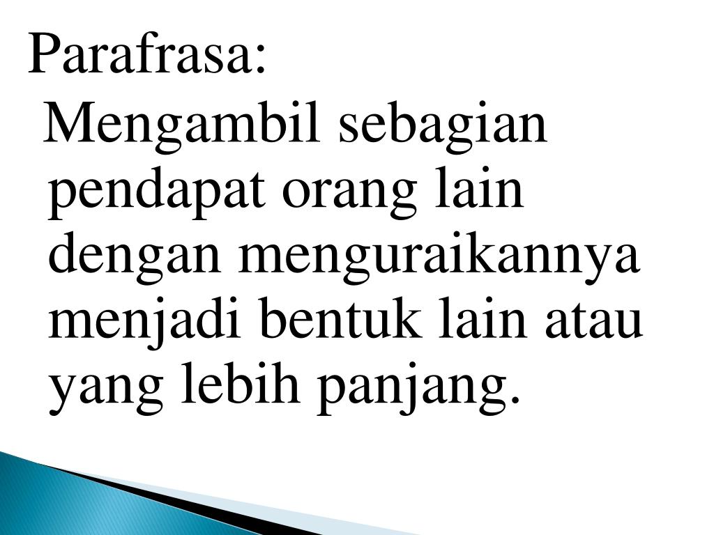 Parafrasa: Mengambilsebagianpendapatorang lain denganmenguraikannyamenjadibentuk lain atau yang lebihpanjang.