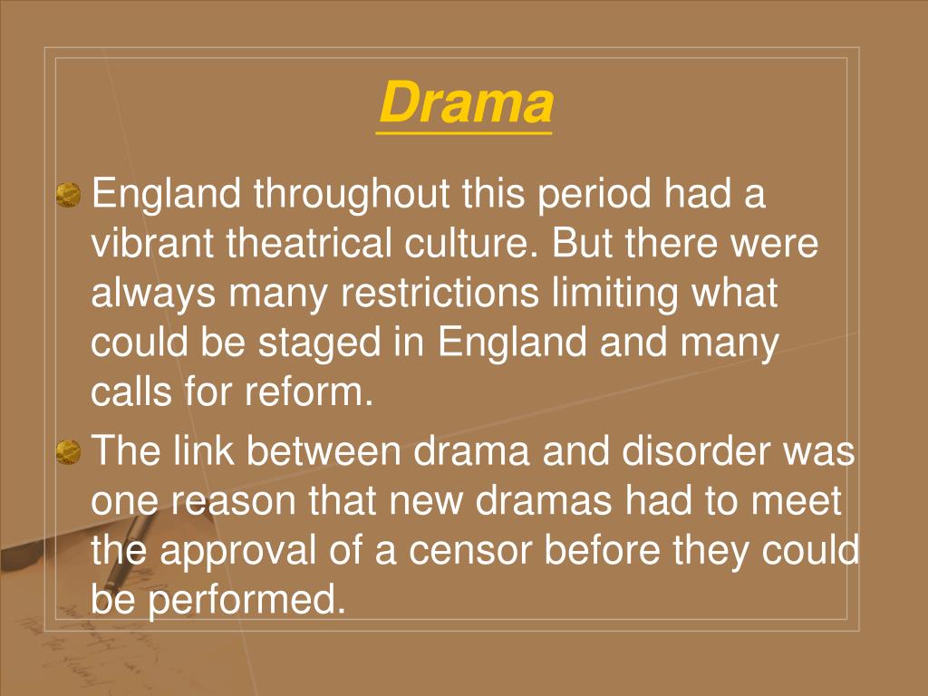 Drama • England throughout this period had a vibrant theatrical culture. But there were always many restrictions limiting what could be staged in England and many calls for reform. • The link between drama and disorder was one reason that new dramas had to meet the approval of a censor before they could be performed.