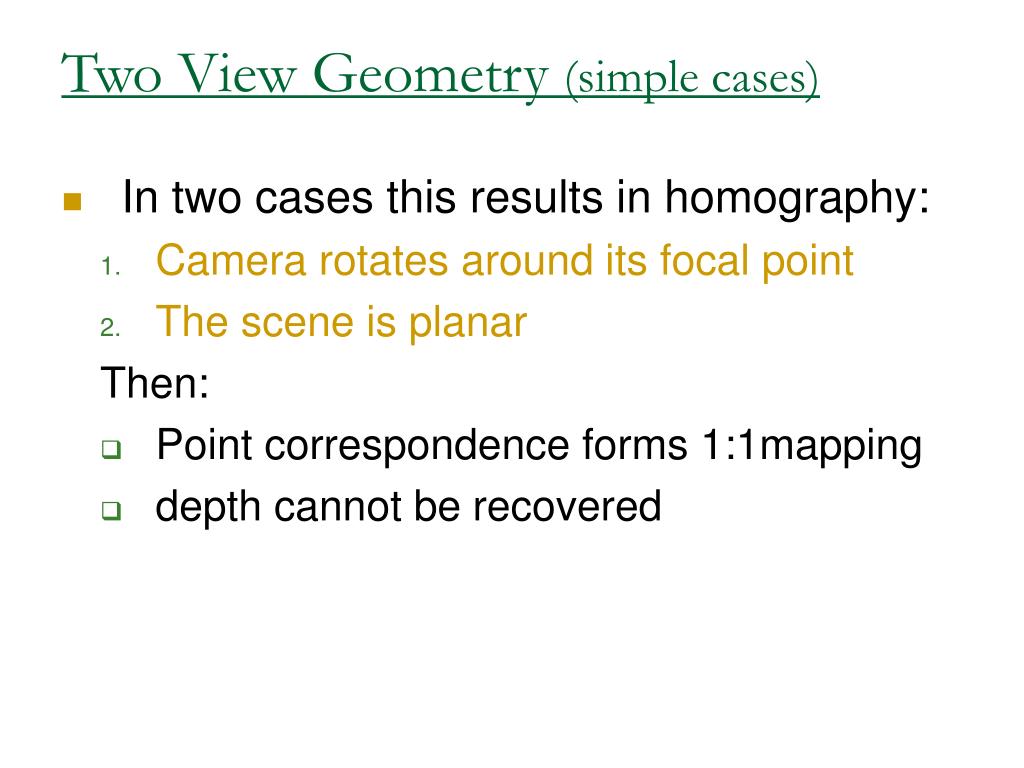 Two View Geometry (simple cases) • In two cases this results in homography: • Camera rotates around its focal point • The scene is planar Then: • Point correspondence forms 1:1mapping • depth cannot be recovered