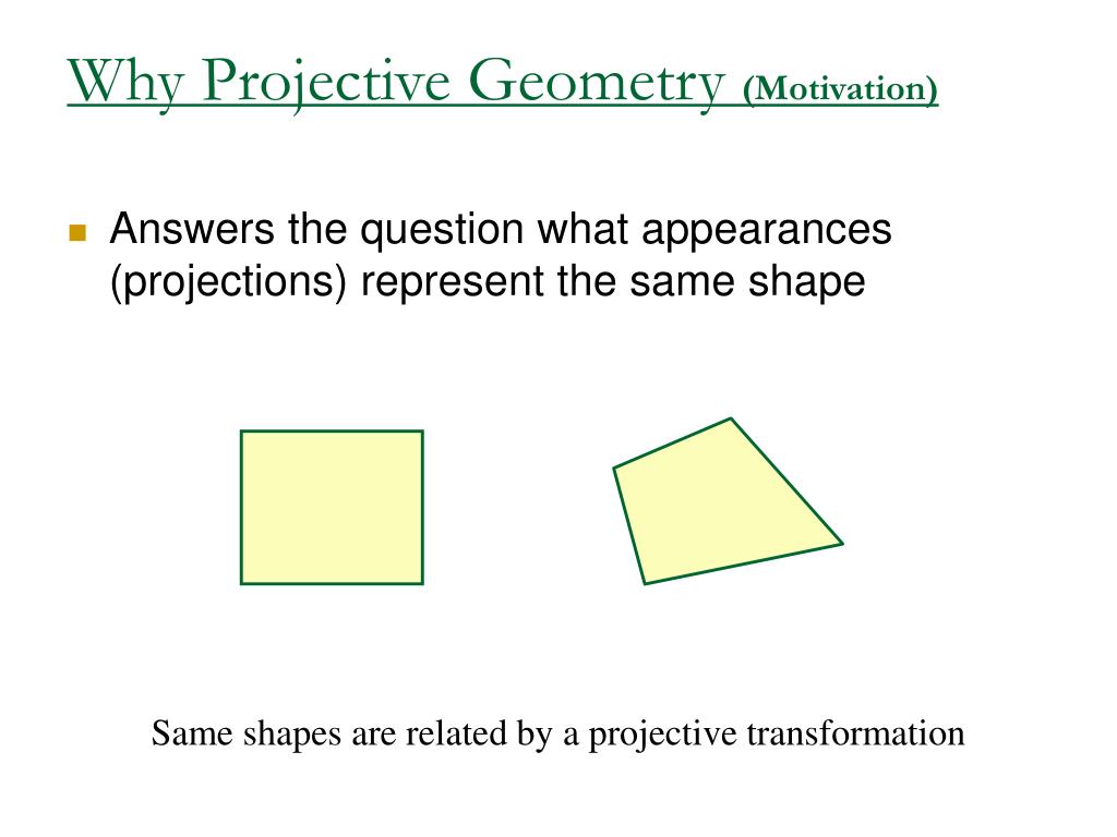 Why Projective Geometry (Motivation) • Answers the question what appearances (projections) represent the same shape Same shapes are related by a projective transformation