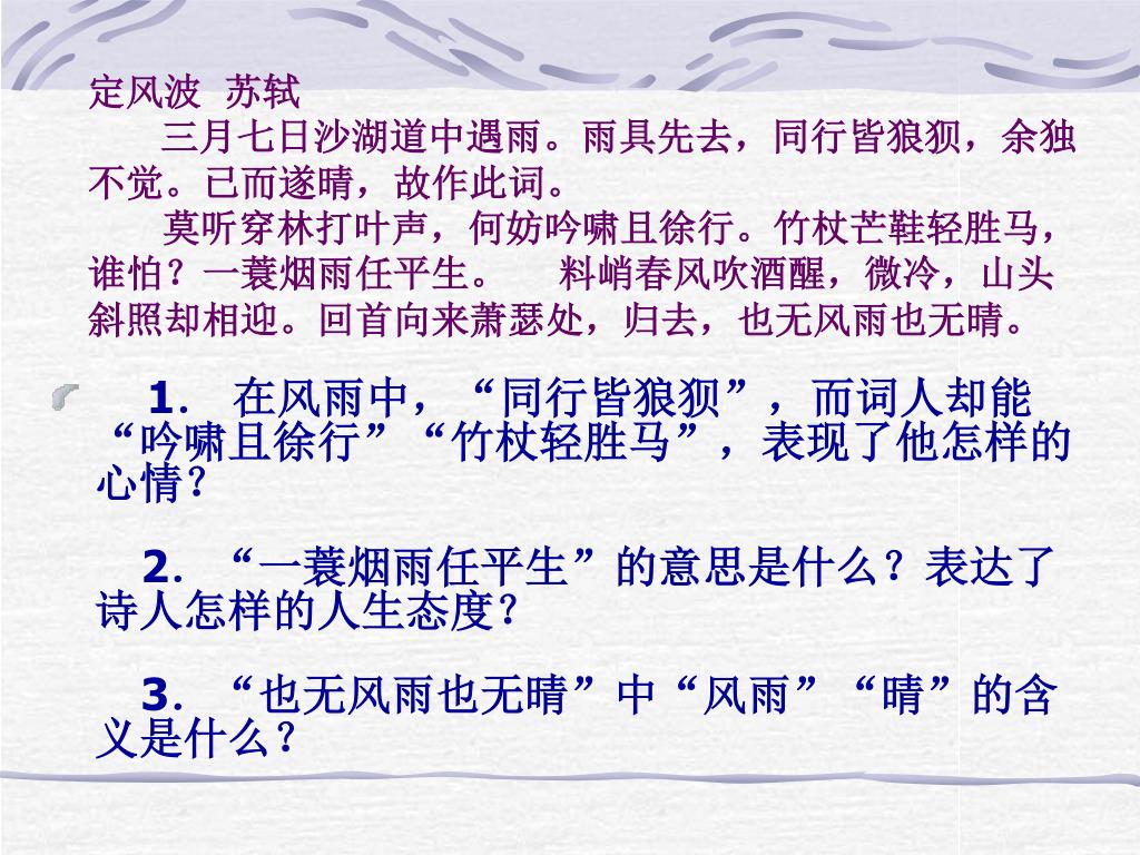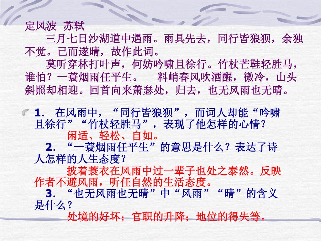 定风波 苏轼 三月七日沙湖道中遇雨。雨具先去,同行皆狼狈,余独不觉。已而遂晴,故作此词。 莫听穿林打叶声,何妨吟啸且徐行。竹杖芒鞋轻胜马,谁怕?一蓑烟雨任平生。 料峭春风吹酒醒,微冷,山头斜照却相迎。回首向来萧瑟处,归去,也无风雨也无晴。 • 1. 在风雨中,“同行皆狼狈”,而词人却能“吟啸且徐行”“竹杖轻胜马”,表现了他怎样的心情? 2.“一蓑烟雨任平生”的意思是什么?表达了诗人怎样的人生态度? 3.“也无风雨也无晴”中“风雨”“晴”的含义是什么?