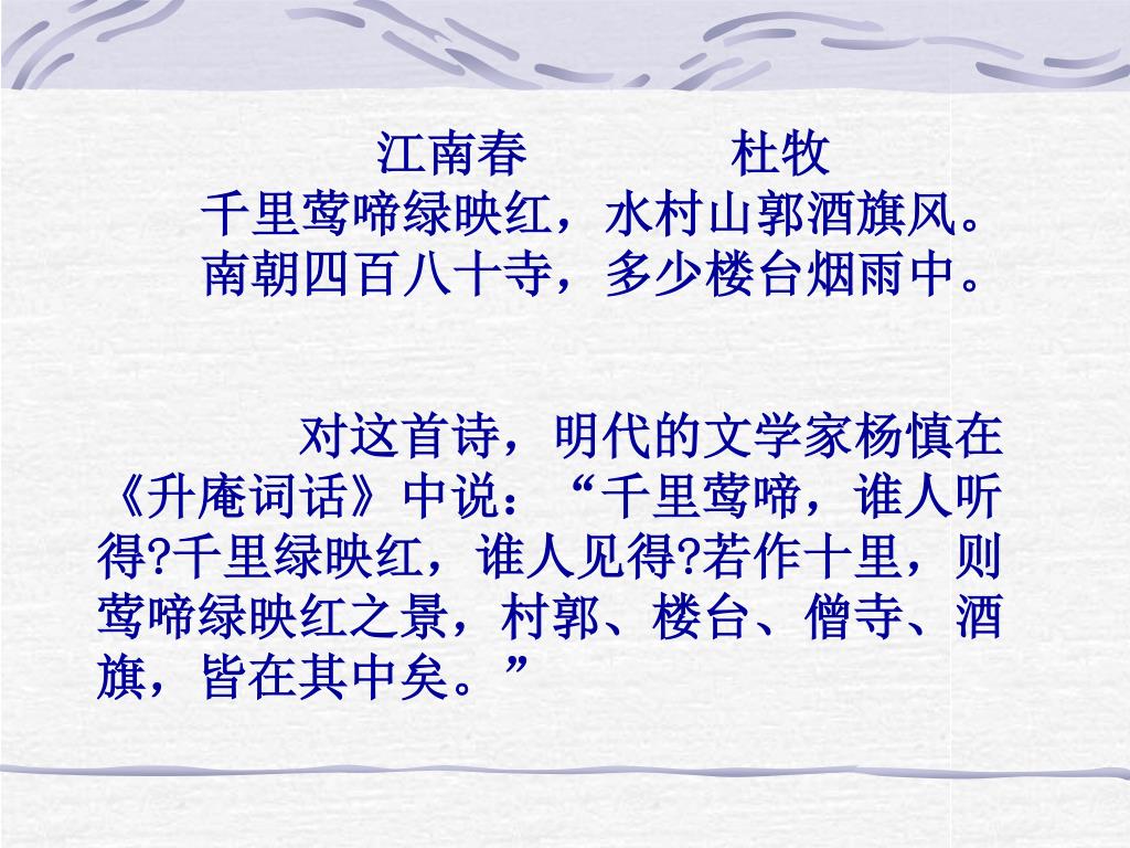 江南春 杜牧 千里莺啼绿映红,水村山郭酒旗风。 南朝四百八十寺,多少楼台烟雨中。 对这首诗,明代的文学家杨慎在《升庵词话》中说:“千里莺啼,谁人听得?千里绿映红,谁人见得?若作十里,则莺啼绿映红之景,村郭、楼台、僧寺、酒旗,皆在其中矣。”