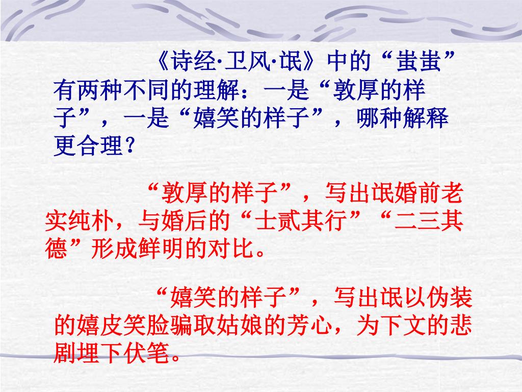 《诗经·卫风·氓》中的“蚩蚩”有两种不同的理解:一是“敦厚的样子”,一是“嬉笑的样子”,哪种解释更合理? “敦厚的样子”,写出氓婚前老实纯朴,与婚后的“士贰其行”“二三其德”形成鲜明的对比。 “嬉笑的样子”,写出氓以伪装的嬉皮笑脸骗取姑娘的芳心,为下文的悲剧埋下伏笔。