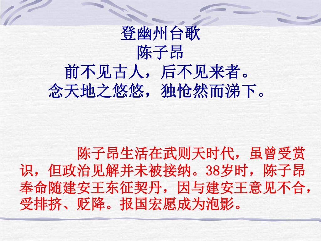 登幽州台歌 陈子昂 前不见古人,后不见来者。 念天地之悠悠,独怆然而涕下。 陈子昂生活在武则天时代,虽曾受赏识,但政治见解并未被接纳。38岁时,陈子昂奉命随建安王东征契丹,因与建安王意见不合,受排挤、贬降。报国宏愿成为泡影。