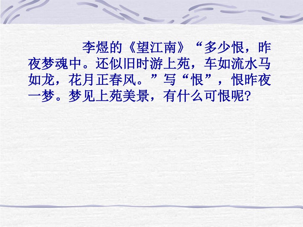 李煜的《望江南》“多少恨,昨夜梦魂中。还似旧时游上苑,车如流水马如龙,花月正春风。”写“恨”,恨昨夜一梦。梦见上苑美景,有什么可恨呢?
