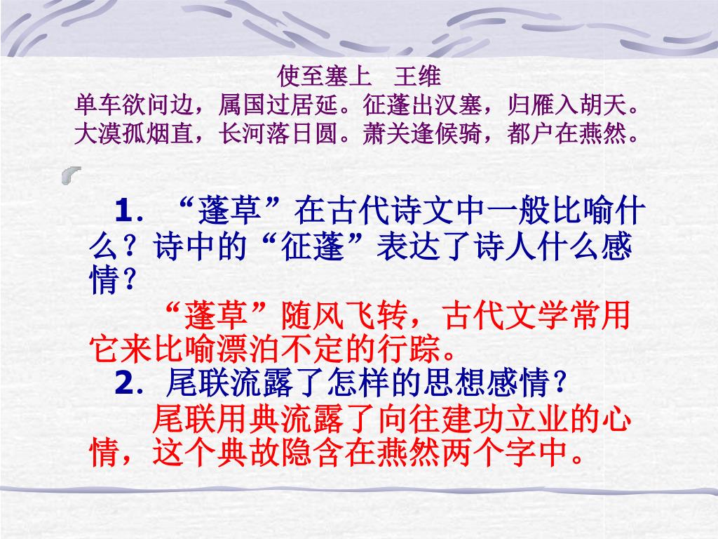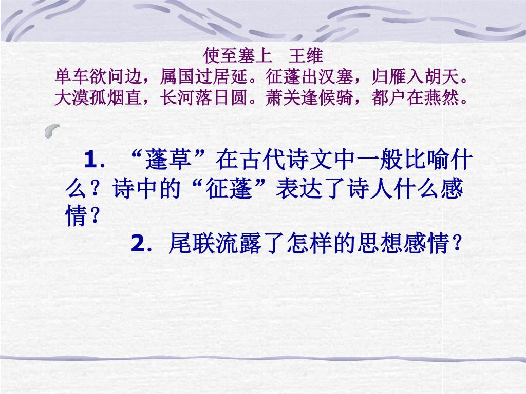 使至塞上 王维 单车欲问边,属国过居延。征蓬出汉塞,归雁入胡天。 大漠孤烟直,长河落日圆。萧关逢候骑,都户在燕然。 • 1.“蓬草”在古代诗文中一般比喻什么?诗中的“征蓬”表达了诗人什么感情? “蓬草”随风飞转,古代文学常用它来比喻漂泊不定的行踪。2.尾联流露了怎样的思想感情? 尾联用典流露了向往建功立业的心情,这个典故隐含在燕然两个字中。