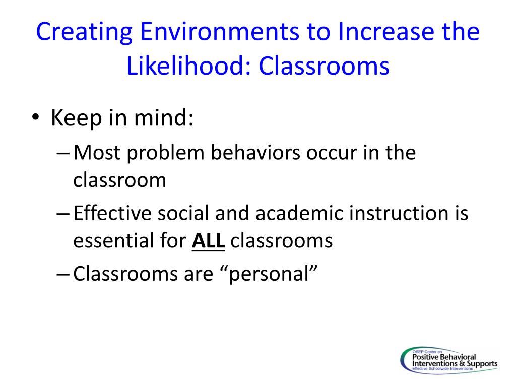 Creating Environments to Increase the Likelihood: Classrooms • Keep in mind: • Most problem behaviors occur in the classroom • Effective social and academic instruction is essential for ALLclassrooms • Classrooms are “personal”