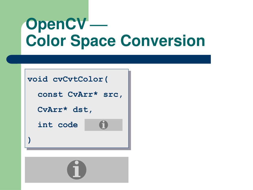 OpenCV Color Space Conversion void cvCvtColor( const CvArr* src, CvArr* dst, int code )