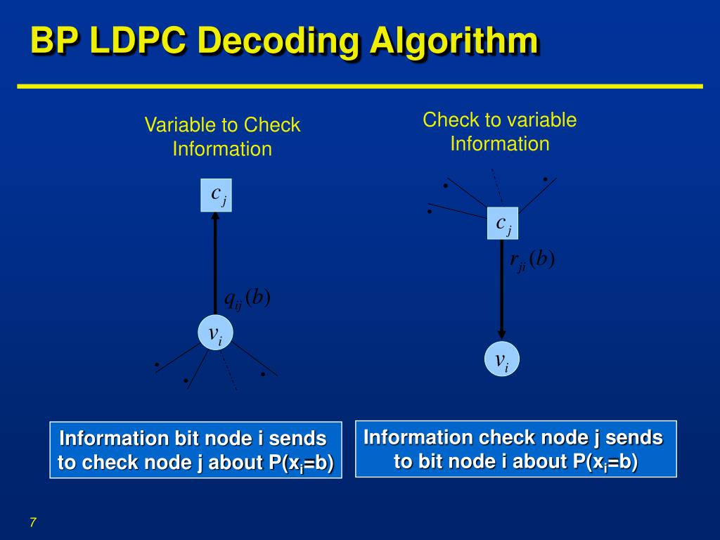 BP LDPC Decoding Algorithm Check to variable Information Variable to Check Information Information check node j sends to bit node i about P(xi=b) Information bit node i sends to check node j about P(xi=b)