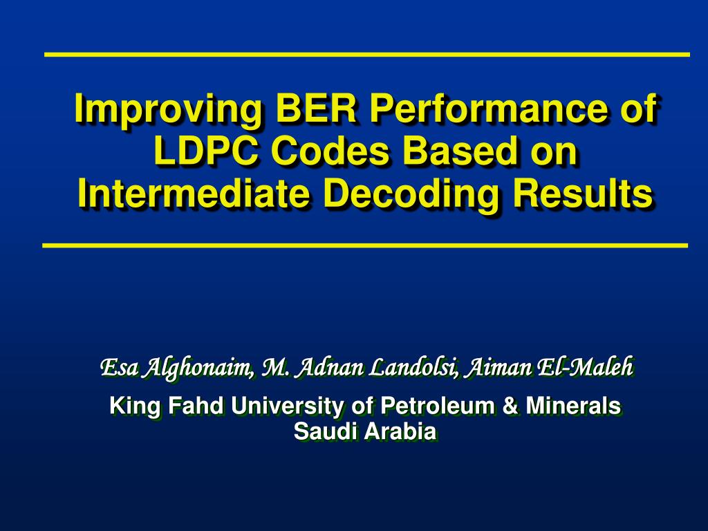 Improving BER Performance of LDPC Codes Based on Intermediate Decoding Results Esa Alghonaim, M. Adnan Landolsi, Aiman El-Maleh King Fahd University of Petroleum & Minerals Saudi Arabia