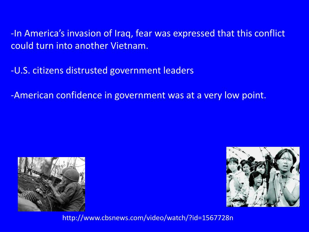 In America’s invasion of Iraq, fear was expressed that this conflict could turn into another Vietnam. • U.S. citizens distrusted government leaders • American confidence in government was at a very low point. http://www.cbsnews.com/video/watch/?id=1567728n