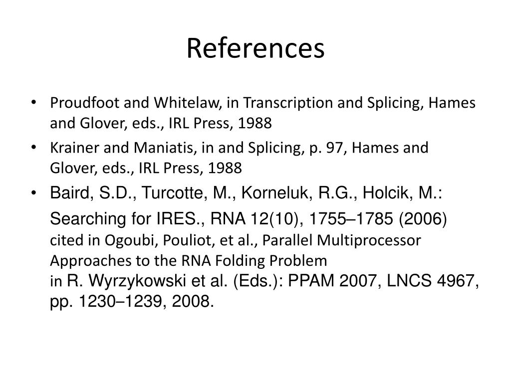References • Proudfoot and Whitelaw, in Transcription and Splicing, Hames and Glover, eds., IRL Press, 1988 • Krainer and Maniatis, in and Splicing, p. 97, Hames and Glover, eds., IRL Press, 1988 • Baird, S.D., Turcotte, M., Korneluk, R.G., Holcik, M.: Searching for IRES., RNA 12(10), 1755–1785 (2006)cited in Ogoubi, Pouliot, et al., Parallel Multiprocessor Approaches to the RNA Folding Problemin R. Wyrzykowski et al. (Eds.): PPAM 2007, LNCS 4967, pp. 1230–1239, 2008.