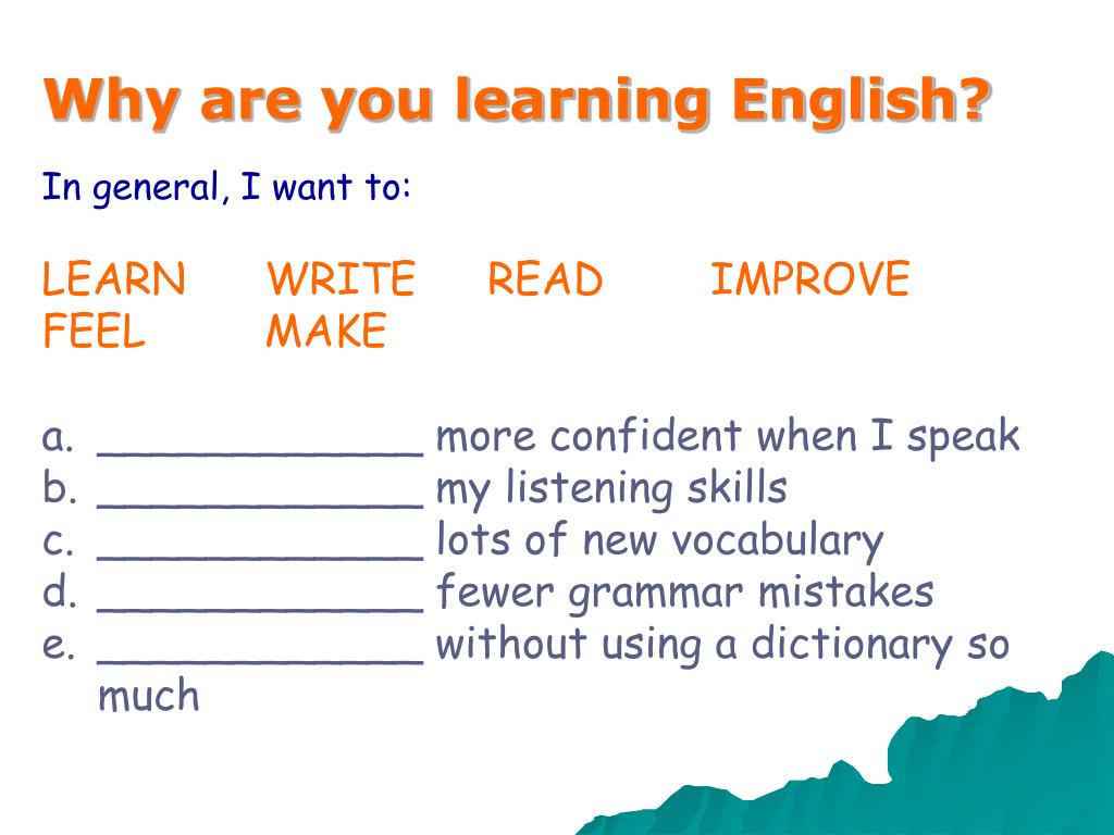Why are you learning English? • In general, I want to: • LEARN WRITE READ IMPROVE • FEEL MAKE • ____________ more confident when I speak • ____________ my listening skills • ____________ lots of new vocabulary • ____________ fewer grammar mistakes • ____________ without using a dictionary so much