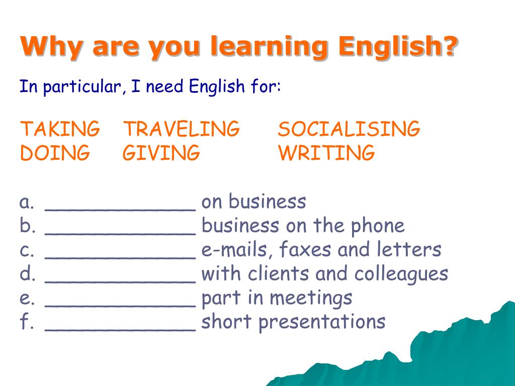 Why are you learning English? • In particular, I need English for: • TAKING TRAVELING SOCIALISING • DOING GIVING WRITING • ____________ on business • ____________ business on the phone • ____________ e-mails, faxes and letters • ____________ with clients and colleagues • ____________ part in meetings • ____________ short presentations