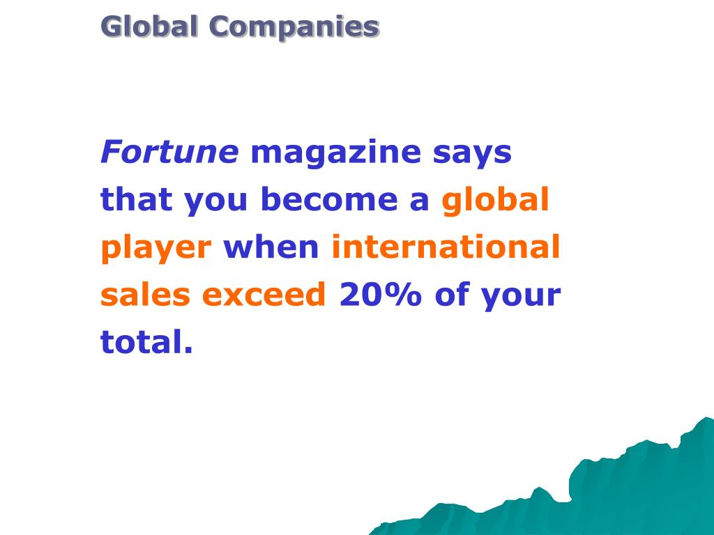 Global Companies Fortune magazine says that you become a global player when international salesexceed 20% of your total.