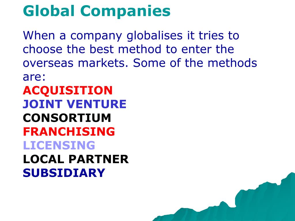Global Companies When a company globalises it tries to choose the best method to enter the overseas markets. Some of the methods are: ACQUISITION JOINT VENTURE CONSORTIUM FRANCHISING LICENSING LOCAL PARTNER SUBSIDIARY