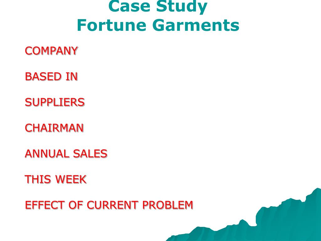 Case Study Fortune Garments COMPANY BASED IN SUPPLIERS CHAIRMAN ANNUAL SALES THIS WEEK EFFECT OF CURRENT PROBLEM