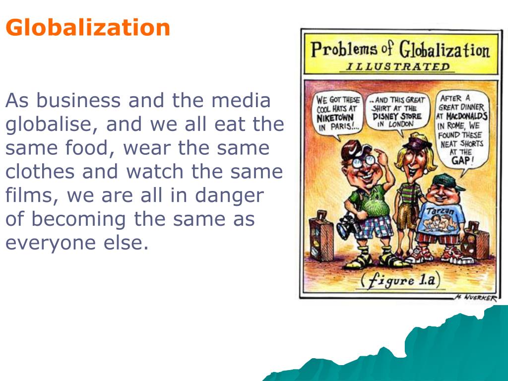 Globalization As business and the media globalise, and we all eat the same food, wear the same clothes and watch the same films, we are all in danger of becoming the same as everyone else.