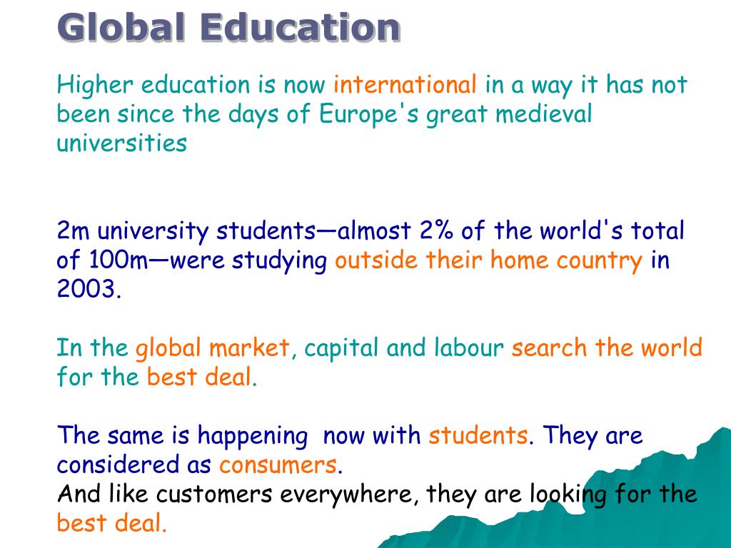 Global Education Higher education is now international in a way it has not been since the days of Europe's great medieval universities 2m university students—almost 2% of the world's total of 100m—were studying outside their home country in 2003. In the global market, capital and labour search the world for the best deal. The same is happening now with students. They are considered as consumers. And like customers everywhere, they are looking for the best deal.